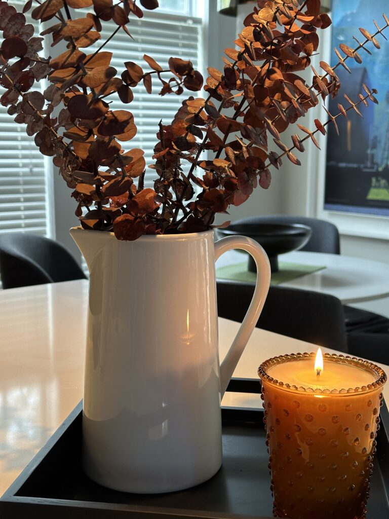 Decorate your kitchen with the rule of threes as well. I love how this grouping turned out. I’ve got a great white, ceramic vase that I filled with brown eucalyptus branches. I found an amber, knob glass candle that picks up shades within the eucalyptus perfectly. And for the third element, a modern black tray to section it off from the rest of the counter. PERFECTION!